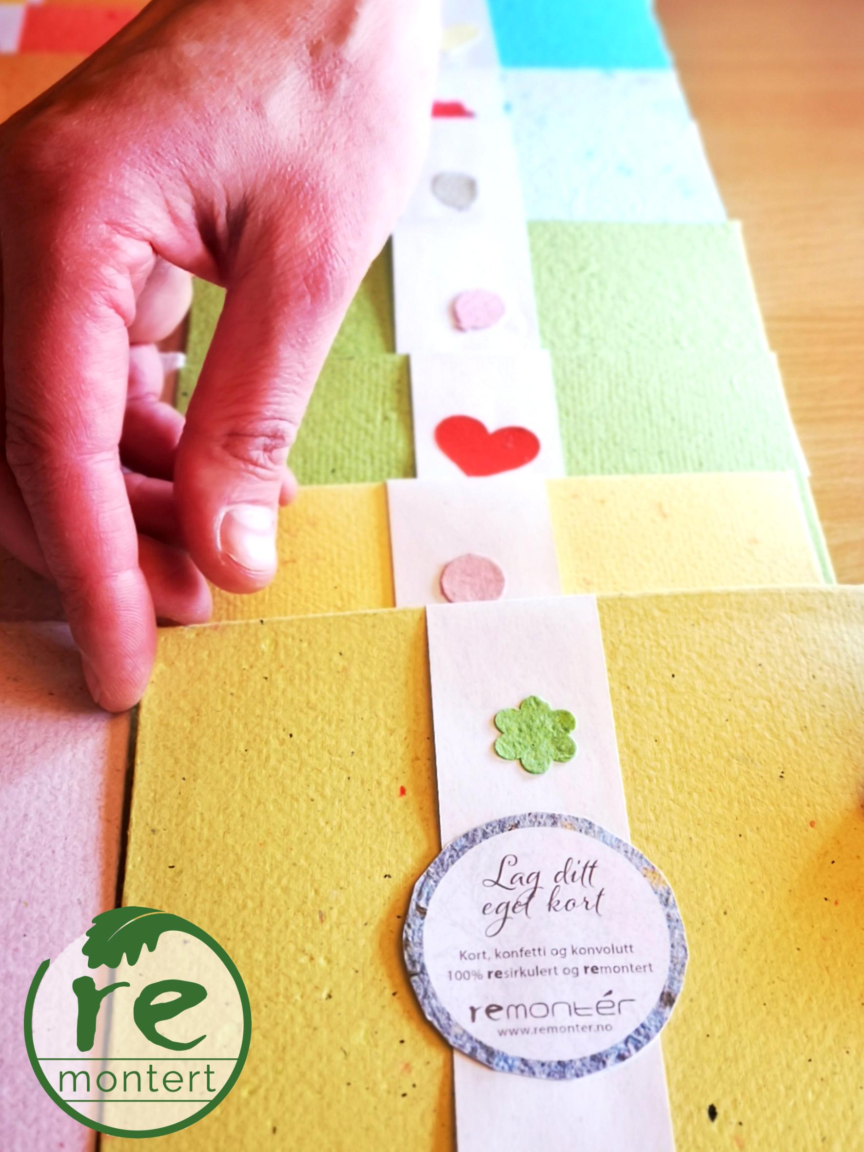 Produktene er laget av resirkulert papir og kartong. Papiret har unik tekstur og farge. Vi pakker farger vi synes passer sammen i hvert sett.